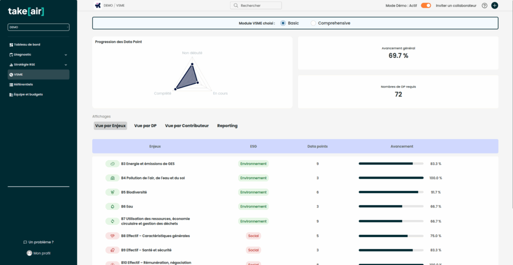 C’est une plateforme qui centralise vos données ESG, structure votre plan d’action et automatise le reporting (ex. export PDF/PPT).